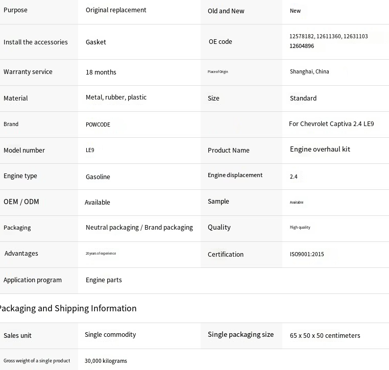 Двигатель LE9 широко применялся в таких автомобилях, как chevrolet Captiva (kopacha), с 2,4 - литровым четырёхцилиндровым четырёхцилиндровым двигателем с хорошей надежностью и доступностью для ремонта. При восстановлении двигателя, набор для ремонта, совпадающий с спецификациями завода, может эффективно восстанавливать мощность и герметичность.