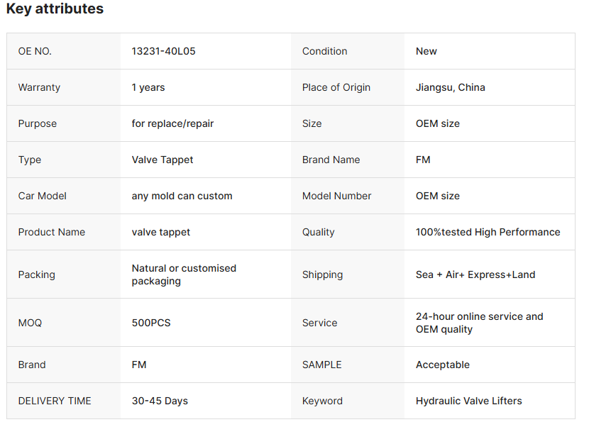 Основные компоненты продукции: высокопроизводительный гидропневматический стержень, разработанный специально для двигателей nissan CD20 RD28, доступен для многих моделей и двигателей. Она включает в себя стопроцентную гарантию качества, естественную или индивидуальную упаковку, а также глобальные распределительные услуги, предоставляемые через морские, воздушные, курьерские и наземные перевозки. Продукция поддерживает несколько типов двигателей и предоставляет от 30 до 45 дней на доставку.